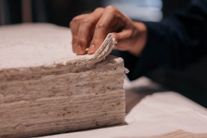 由於本案所需求的紙張需在戶外環境中維持長達三個月之久,建築師們希望我們所建議的紙張可以有耐久耐候,不因日曬、風吹、雨淋而受損。此外,因設計上須以筆墨上色呈現東方意象,紙材可以吸收墨色不脫落也是一大重點。根據以上,我們提出以材質輕盈透亮的薄纖紙畫上墨色後再塗布防水層的作法,並推薦友好合作廠商恆儀發展實業一起實驗外部塗層,提供紙材複合技術。